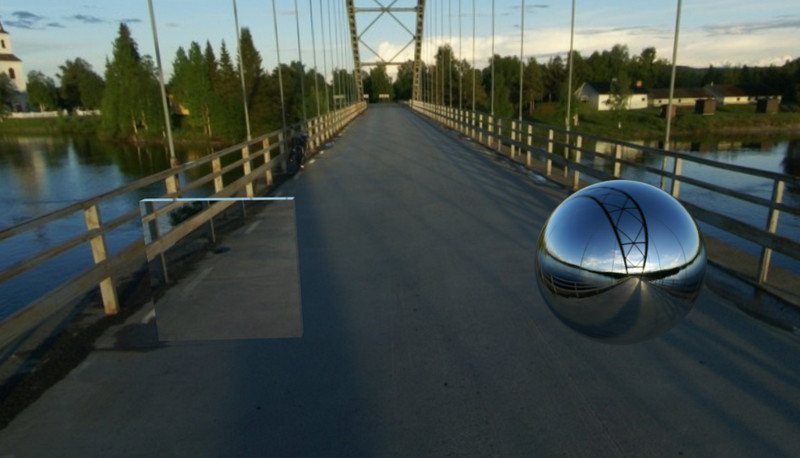 使用THREE.CubeCamera可以为场景中所要渲染的物体创建快照,并使用这些快照创建CubeMap对象。但是需要确保摄像机被放置在THREE.Mesh网格上你所想显示反射的位置上。例如,我们想在球体的中心显示反射,由于球体所处的位置是(0, 0, 0),所以我们没有显示的指定THREE.CubeCamera的位置。我们只是将动态反射应用于球体上,所以把它的envMap设置为cubeCamera.renderTarget