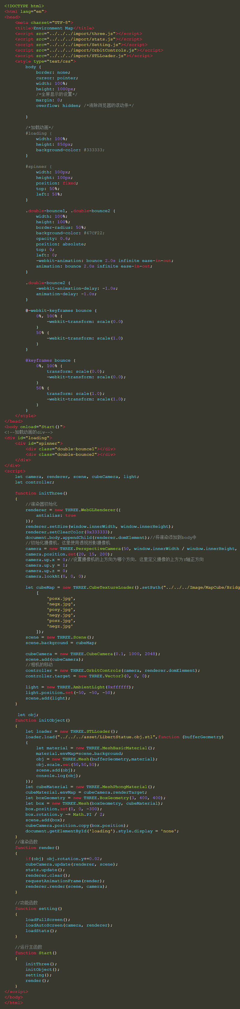 这段代码中,我们从外部加载了一个stl格式的模型,也可以就使用简单的几何体来演示。下面的一部分代码就创建了可以反射的镜子。